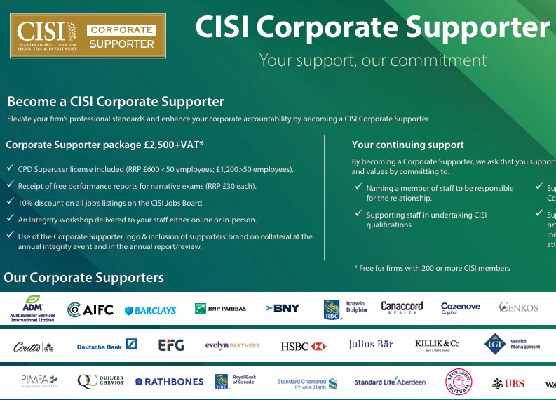 Organisations across the financial services professional sector have the opportunity to become corporate supporters. On one level, this is a public endorsement by the corporate supporter of the aims and objectives of the CISI including support of the Institute’s Code of Conduct. Supporters are entitled to use the CISI logo and demonstrate a shared commitment to high standards of excellence and professionalism.